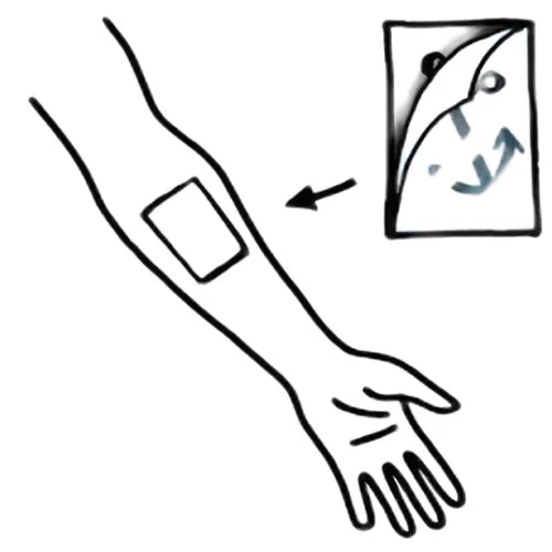 Peel of the plastic film and stick the tattoo sticker to the shaved area [sticky side facing the skin - blue side facing outside]